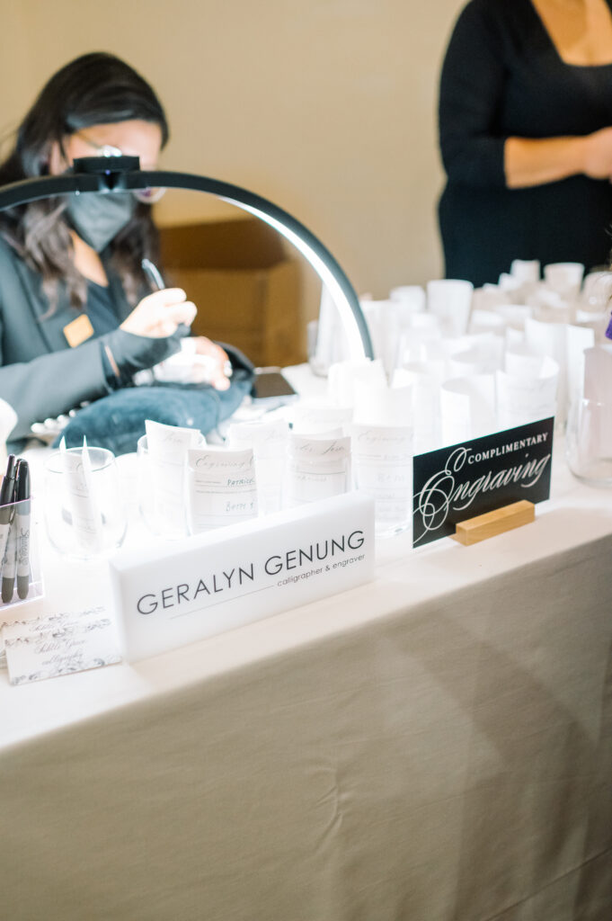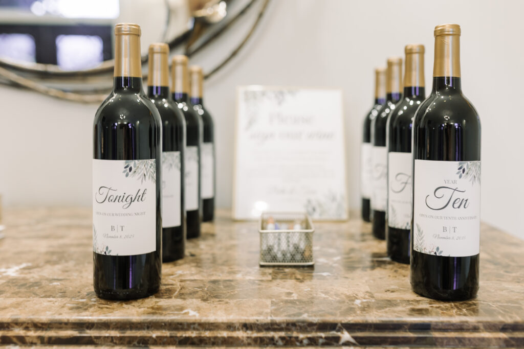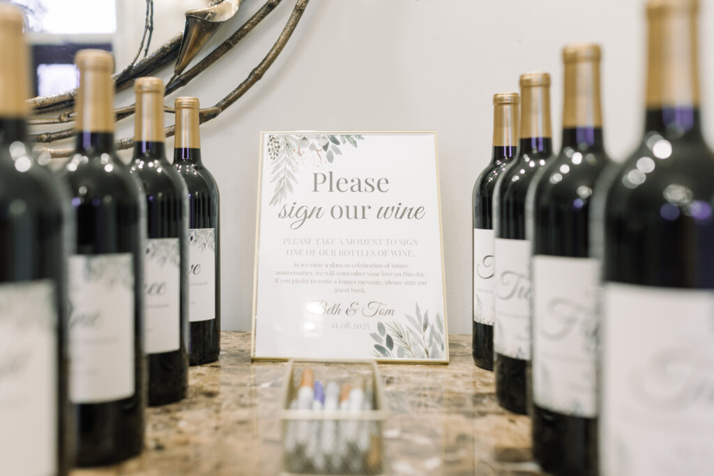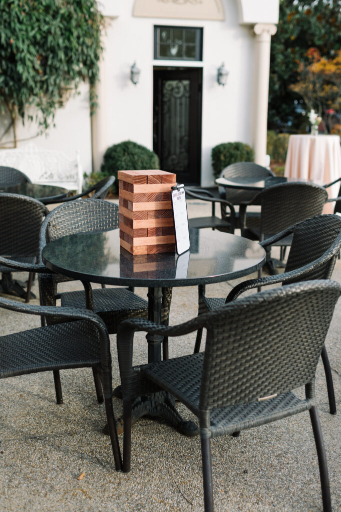 The cocktail hour in the Morais courtyard was designed to be a fun playground! While some guests engaged in a bit of friendly competition with personalized lawn games like Jenga, cornhole, and ring toss, others took home a personalized gift. We arranged for live calligraphy, where guests received custom wine cups—a nod to the vineyard setting. In lieu of a traditional guest book, friends and family signed wine bottles that Beth and Tom will open on their future anniversaries, turning a wedding moment into a lifelong tradition.