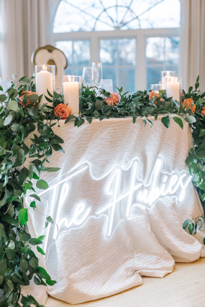 The Creative Challenge: The Neon Glow One of my favorite “labor of love” details was the custom LED sign adorning the sweetheart table. Securing the sign safely and aesthetically was a technical challenge, but the result was a stunning, focal point that showcased the couple in a personalized glow all night long.