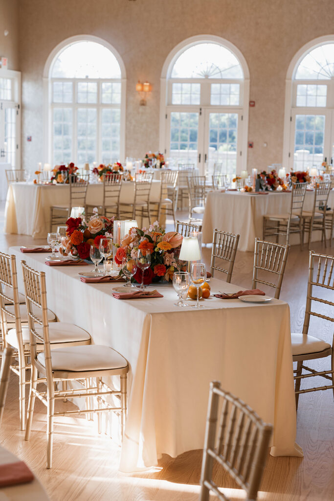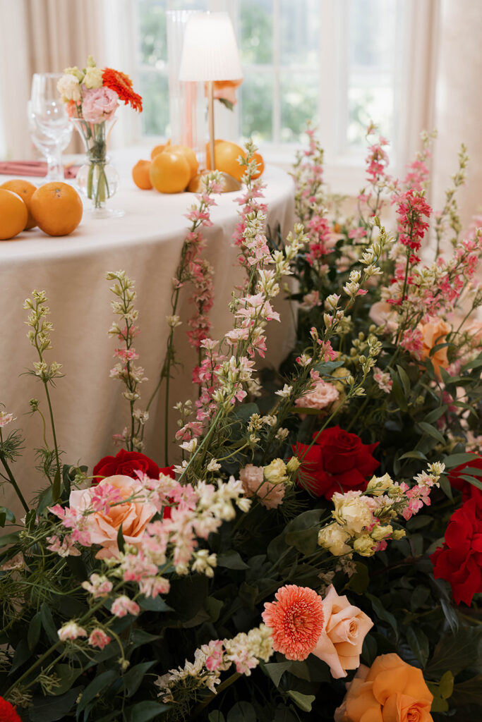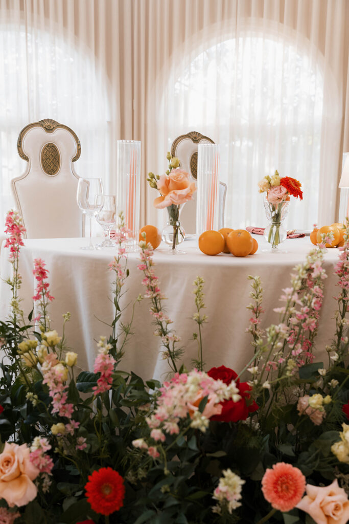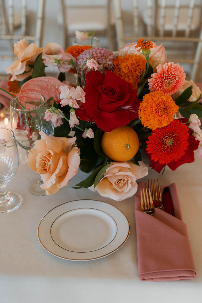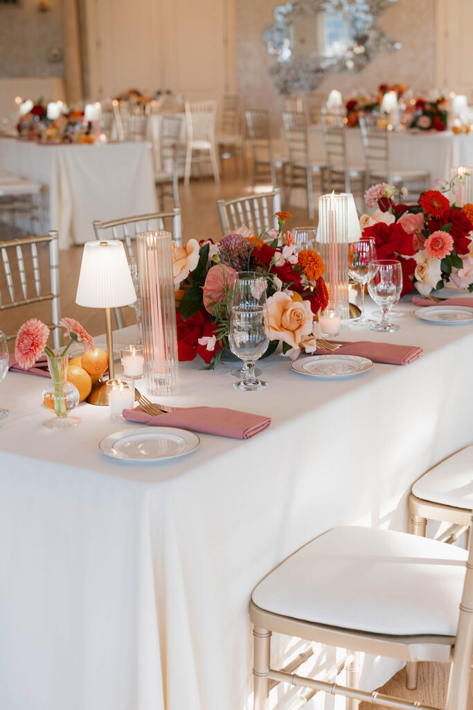 Ashley and Brian’s ceremony was intentionally intimate, allowing every detail to feel meaningful and beautifully curated. Inspired by the warmth and romance of a sunset, the bride envisioned a color palette that felt rich, glowing, and full of depth. Florals took center stage, transforming the grand ballroom into a romantic garden-inspired setting with lush arrangements of red roses, soft blush blooms, and peach tones that mirrored the hues of the evening sky. From the bride’s bouquet to the candlelit reception tables adorned with fresh citrus and layered textures, each floral moment was thoughtfully designed to reflect their vision and elevate the atmosphere. The result was a celebration that felt personal, refined, and effortlessly romantic.