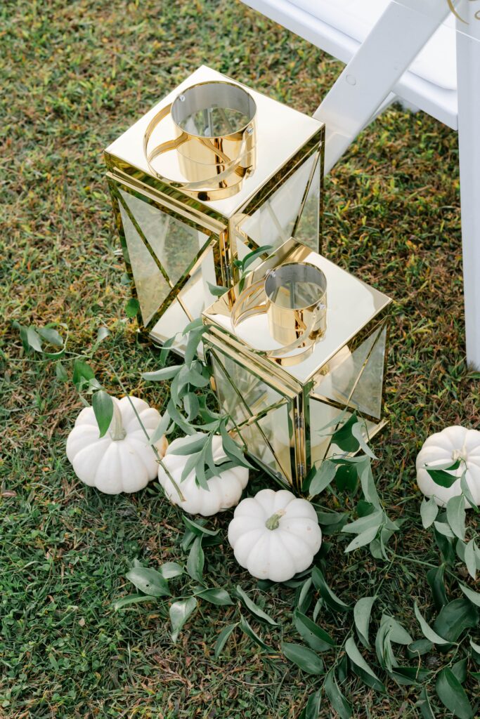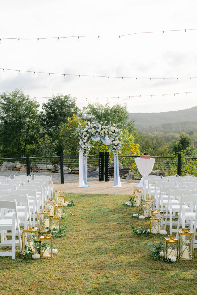 The aisle was lined with gold lanterns, soft candlelight, and touches of greenery, adding warmth and romance to the open-air setting. White folding chairs created a clean, timeless ceremony layout, allowing the floral arch and scenic backdrop to take center stage. As golden hour light settled over the landscape, the entire celebration felt intimate, heartfelt, and serene — a perfect reflection of a love story!