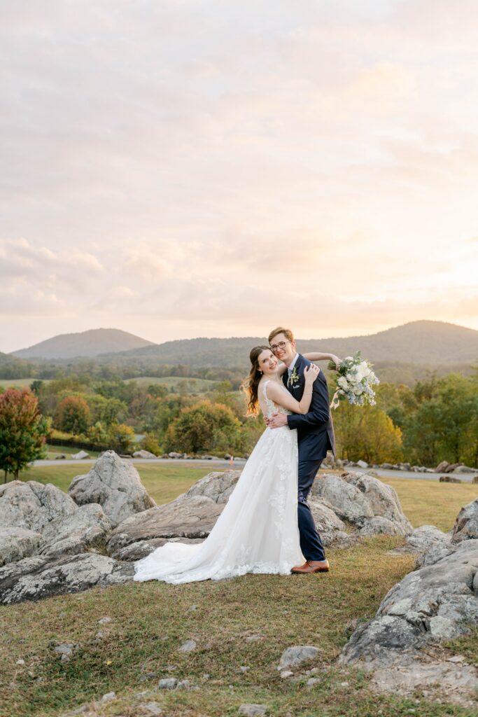 Bob and Kayla’s love story includes just the right mix of adventure and romance. During a weekend getaway in the mountains of Virginia, Bob planned thoughtful surprises — champagne and chocolates! What started as a simple hike quickly turned into an off-roading adventure complete with water crossings and no cell service! On a quiet mountain overlook during a picnic, Bob asked Kayla to marry him — and although neither remembers exactly what was said, they both remember how special it felt.