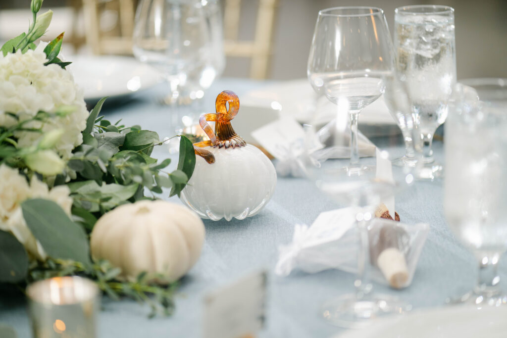 Family craftsmanship was woven into the day as well. The father of the bride lovingly created hand-blown glass pumpkins and wine stoppers for each guest — meaningful, handcrafted favors that doubled as lasting keepsakes.