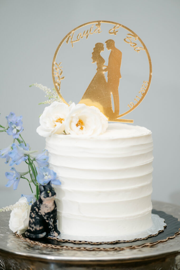 Kayla and Bob infused their romantic wedding day with meaningful details that beautifully reflected their story and family. Their beloved cat, Piper — was featured in the custom cake design and cocktail napkins featuring her photo. The guests enjoyed a personalized crossword puzzle during cocktail hour, every touch felt intentional and uniquely them.