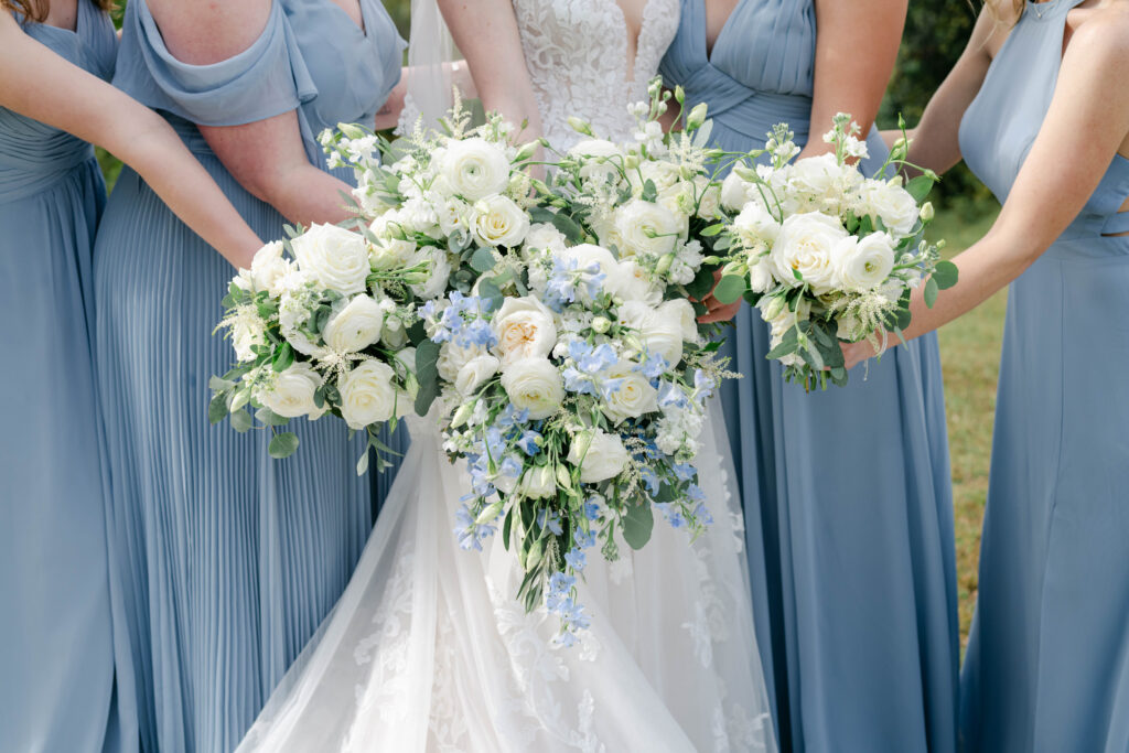 The ceremony design felt both classic and airy, featuring a palette of dusty blue, crisp white, and fresh green. Bridesmaids wore flowing dusty blue gowns in varied silhouettes, creating a look that was cohesive yet beautifully individualized. Their bouquets of white roses and eucalyptus mirrored the florals framing the arbor.